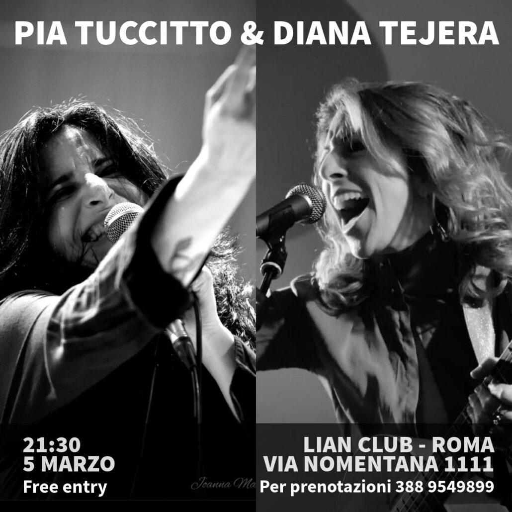 Diana Tejera cantautrice Italo spagnola autrice di canzoni di successo di Tiziano Ferro come “E fuori è buio” si esibirà al “Lian” di Roma in via Nomentana 1111, insieme alla cantautrice Pia Tuccitto che, con il cembalo e l’armonica, sarà accompagnata da Diana con la chitarra .